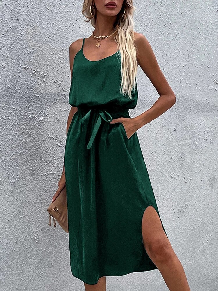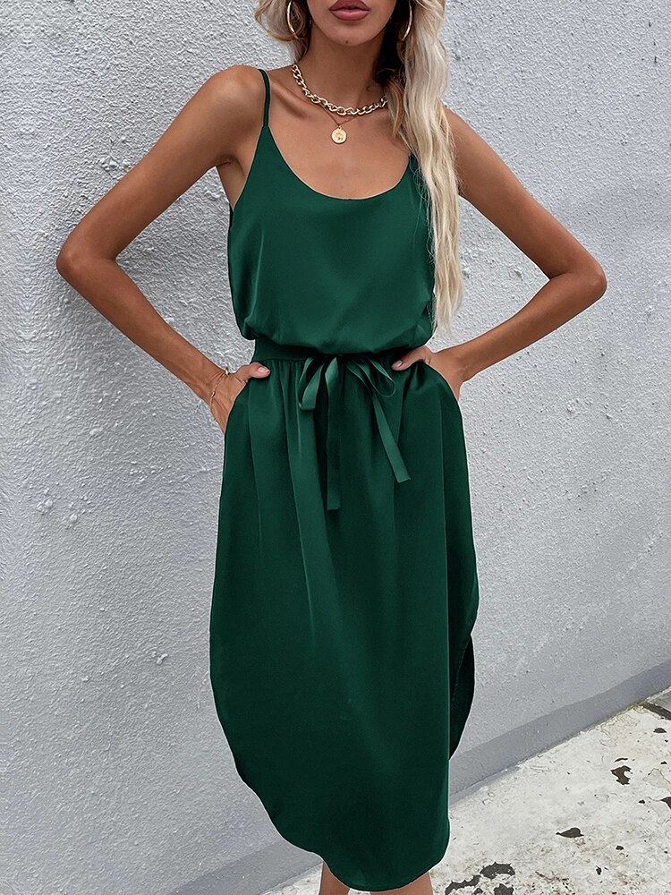 Summer Fashion Sexy Sleeveless Maxi Dress for Women Leisure Solid Green Silk Long Robe Vintage High Waist Women’s Clothes