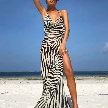 Zebra Print Spaghetti Strap Summer Maxi Dress Sexy Backless Long Beach Dress With Slit Fashion Striped Casual Boho Dress